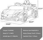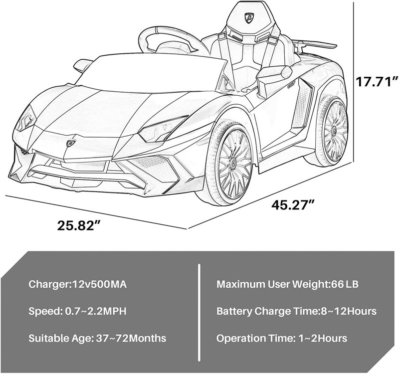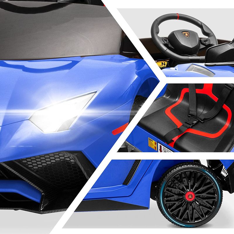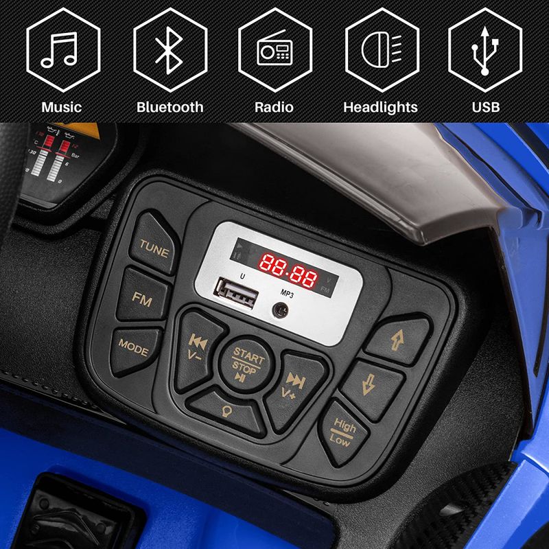 Vem com faróis LED, buzina, sons de motor e portas hidráulicas que balançam como um Lamborghini real. Além disso, há rádio integrado, cabo AUX, porta USB e Bluetooth que permite às crianças ouvir suas músicas favoritas enquanto jogam.