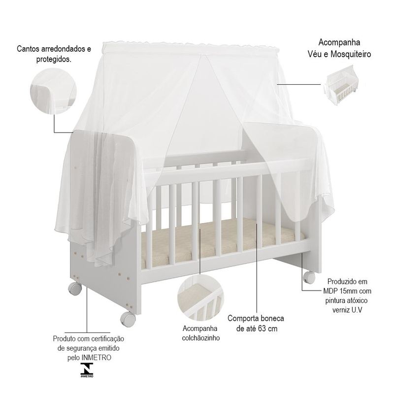 Acompanha colchãozinho, véu e mosquiteiro, para o máximo aconchego da boneca. É produzido com materiais de excelente qualidade, conta com pintura atóxica, bordas arredondadas para maior proteção e possui certificação de segurança emitido pelo INMETRO (Instituto Nacional de Metrologia, Qualidade e Tecnologia). Estimular a imaginação das crianças proporciona uma infância feliz e prazerosa, aproveite e adquira já o seu! Dimensões do produto (L x A x P)