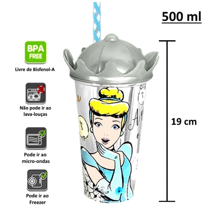 Copo com Coroa da Cinderela com Canudo alta qualidade da Plasutil - 10 Unidades