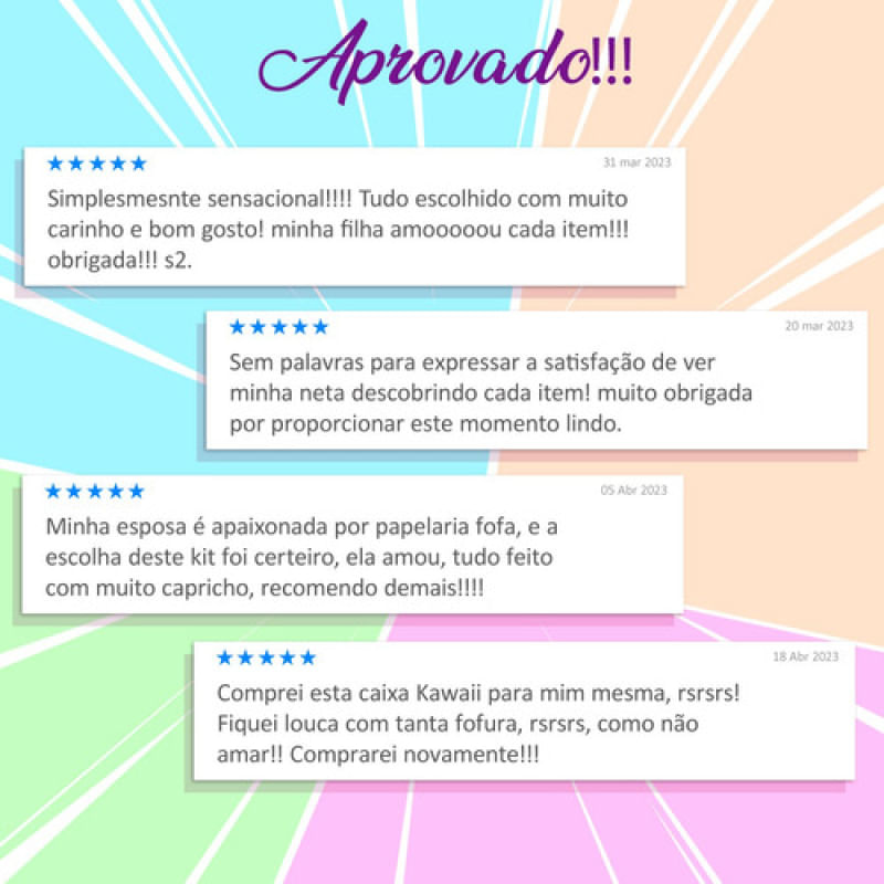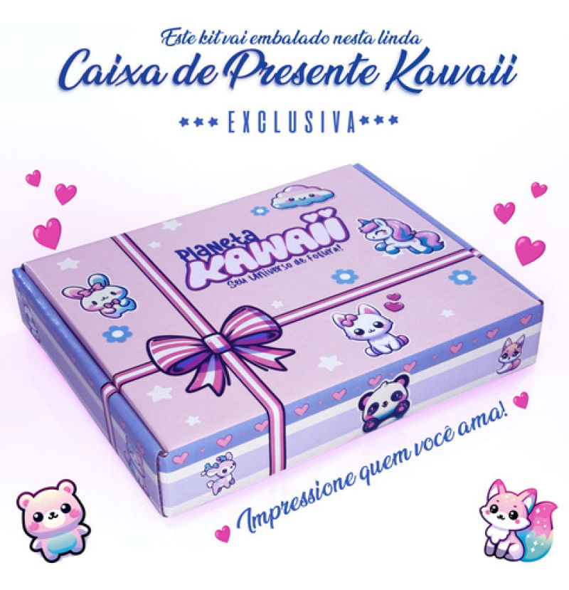 Exclusividade que encanta desde o primeiro olhar! Nosso kit é embalado em uma linda caixa de presente, exclusiva da Planeta Kawaii. Com design adorável e repleto de detalhes fofos, Impressione quem você ama! Nosso kit é a escolha perfeita para quem busca expressar carinho de maneira única e especial.