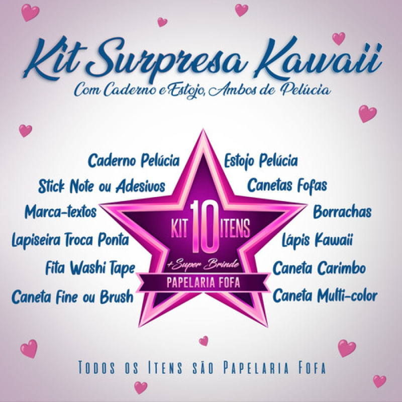 Prepare-se para mergulhar em um mundo de fofura com o nosso exclusivo Kit Surpresa, perfeito para qualquer amante de papelaria que adora adicionar um toque especial ao seu dia a dia. Com 10 itens encantadores, este kit é cuidadosamente selecionado para surpreender e encantar!