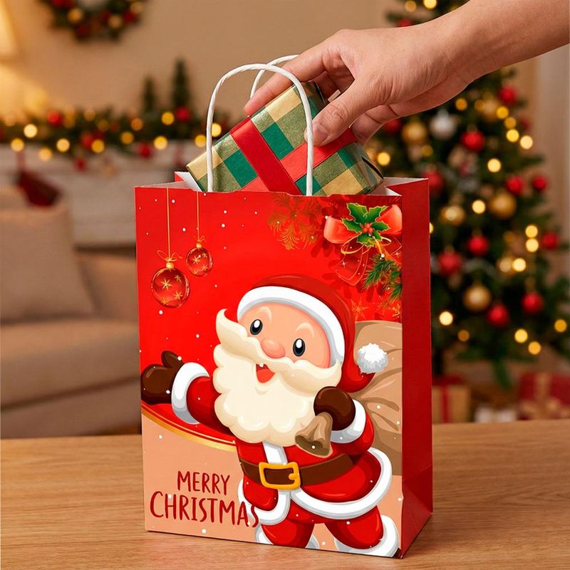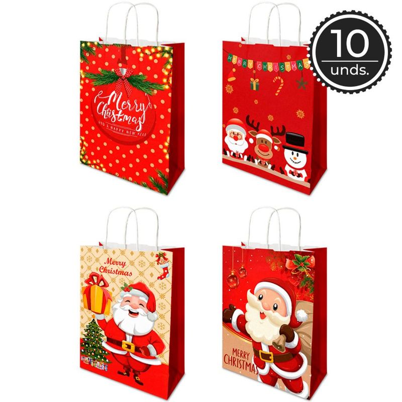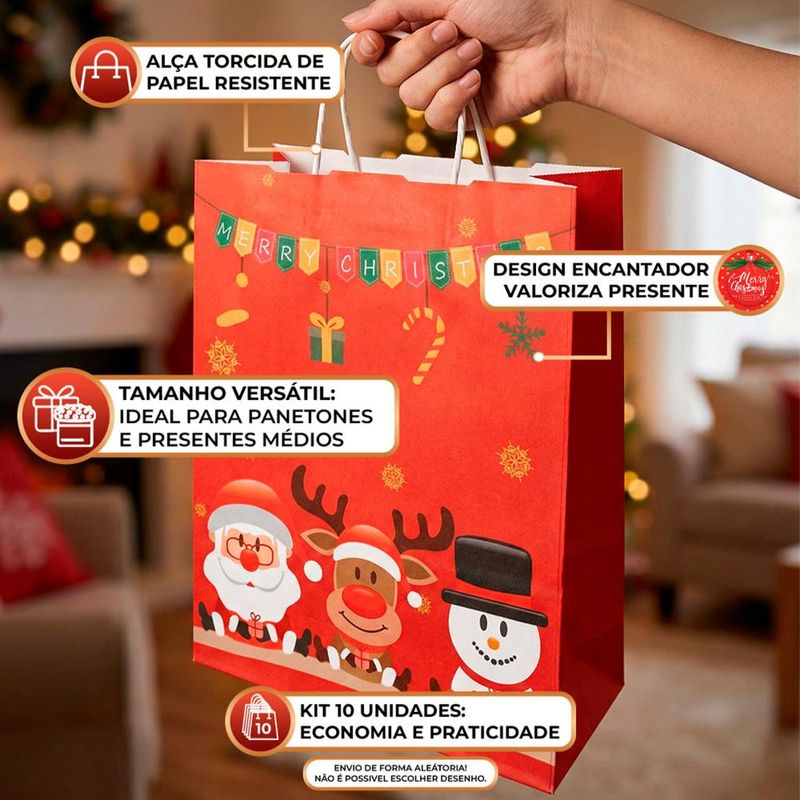 Dê um toque final de carinho e sofisticação aos seus presentes com este Kit de 10 Sacolas de Papel Natalinas! Práticas e encantadoras, elas são a embalagem perfeita para valorizar suas lembranças, evitando o trabalho de embrulhar caixas e garantindo uma apresentação impecável. Com estampas sortidas vibrantes que trazem ícones clássicos como Papai Noel, Renas e Bonecos de Neve, estas sacolas são ideais para presentear amigos, familiares ou colaboradores. Fabricadas em papel resistente com alça torcida, possuem o tamanho ideal (26x22cm) para acomodar panetones de tamanho médio, brinquedos, roupas e kits de cosméticos com segurança e estilo.Kit Econômico Contém 10 unidades com estampas natalinas sortidas Tamanho Versátil Ideal para Panetones e presentes médios Possui alça torcida de papel resistente Estampas com cores vivas e temas clássicos de Natal ATENÇÃO: O modelo é enviado conforme disponibilidade do estoque, não sendo possível escolher a estampa.