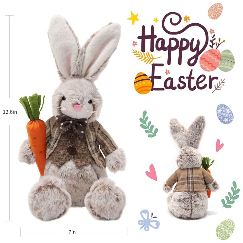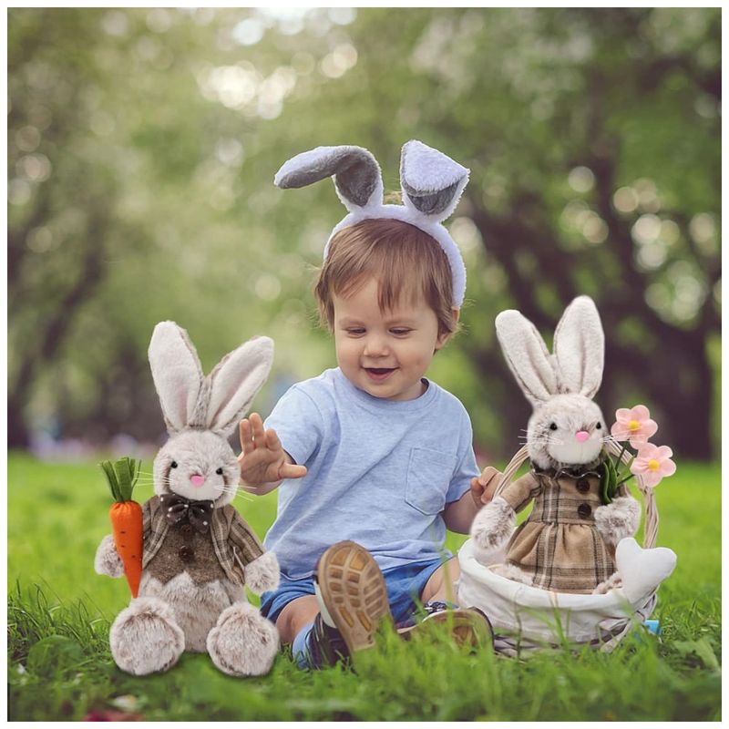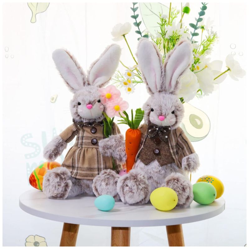 Este casal de coelhos recheados de Páscoa é uma adorável estatueta que pode ser usada como decoração para a casa durante o feriado da Páscoa, bem como em festas de primavera, casamentos, aniversários e outras ocasiões. Eles medem 32,0 cm de altura e 17 cm de largura, e são fáceis para as crianças levarem para qualquer lugar para abraços fofos e aconchegos macios. Os rostos animados desses bonecos de coelho podem atrair instantaneamente a atenção na festa infantil A graciosa Sra. coelhinha com um lindo vestido e segurando duas flores cor de rosa nas mãos, e o cavalheiresco Sr. Coelho vestindo smoking e segurando uma cenoura.