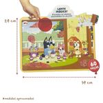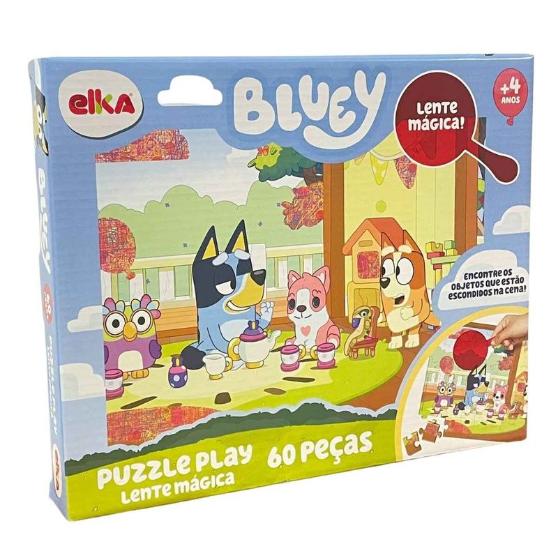 - O quebra cabeça do Bluey contem 60 peças para montar, acompanha uma lente mágica que a criação pode usar para achar 7 objetos escondidos no quebra cabeça.