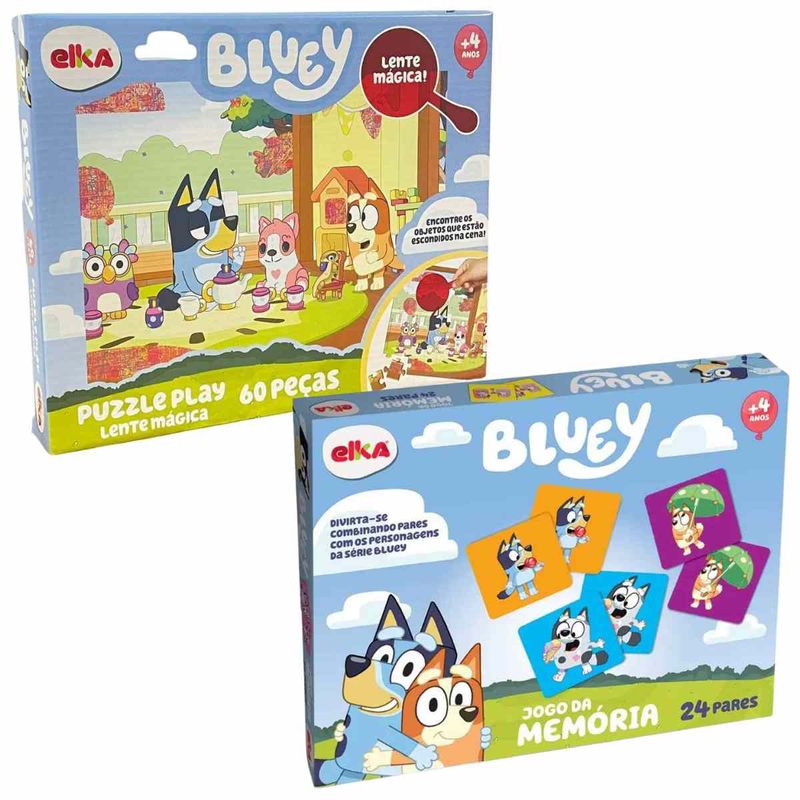Kit contendo os brinquedos: Jogo Da Memória Bluey + Quebra Cabeça 60 Peças Lente Mágica Bluey: