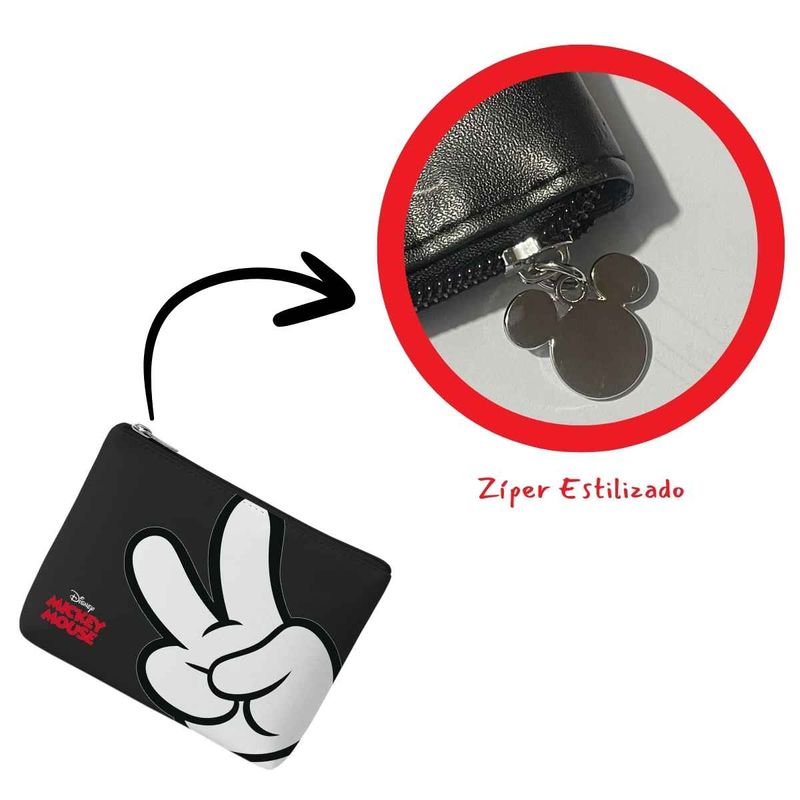 Organização prática para o dia a dia. Design original Disney. Duas cores disponíveis: preto e branco. Zíper resistente nas duas bolsas. Materiais duráveis em poliéster e PVC. Fechamento em zíper.