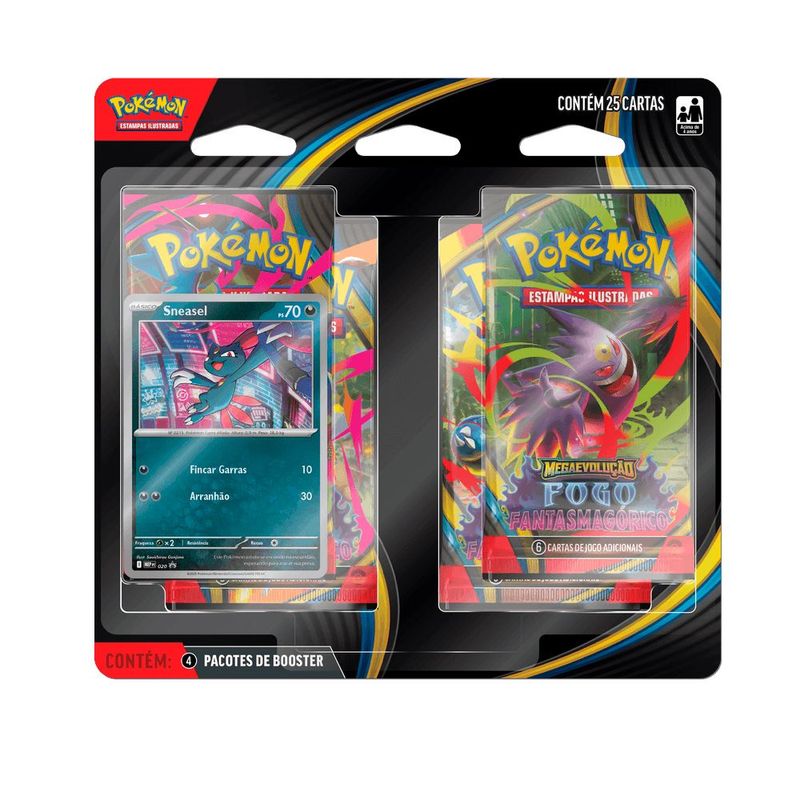 Kit 4 Blister (14 Booster) Megaevolução Fogo Fantasmagórico Marca do produto: Copag. Coleção: Megaevolução Fogo Fantasmagórico - ME02. Conteúdo: 1 Blister Quadruplo Weavile (4 boosters + carta promocional) 1 Blister Quádruplo Sneasel (4 boosters + carta promocional) 1 Blister Triplo Cottonee (3 boosters + carta promocional) 1 Blister Triplo Whimsicott (3 boosters + carta promocional) Acenda um espírito abrasador de batalha! Chamas azuis cauterizantes rasgam um campo escuro de batalha enquanto Mega Charizard X ex observa seus oponentes das alturas! Com um calafrio intenso desafiando o calor, a figura sombria de Mega Gengar ex emerge lentamente, e os dois Pokémon se preparam para o combate. Dispostos a provar sua força, Mega Heracross ex, Mega Lopunny ex e muitos outros Pokémon se alinham para dar tudo de si na expansão Megaevolução — Fogo Fantasmagórico do Pokémon Estampas Ilustradas! Item lacrado de fábrica.