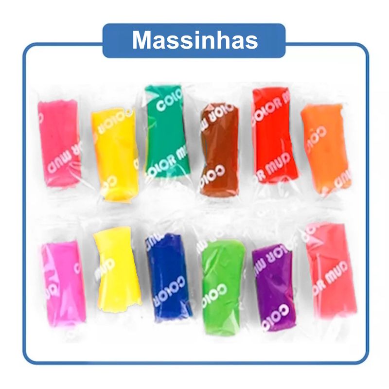 Este Kit de Massinha é completo. Além de ser uma diversão para as crianças, têm funções educativas, auxilia na coordenação motora, lógica e desenvolve muito a criatividade desde pequeno. São 12 massinhas coloridas com formas e acessórios. Vêm em uma caixinha super prática de abrir e fechar para levar a qualquer lugar, mantendo a organização e a diversão, são 3 cores de maletas com acessórios diversos, não sendo possível escolher cores nem acessórios.