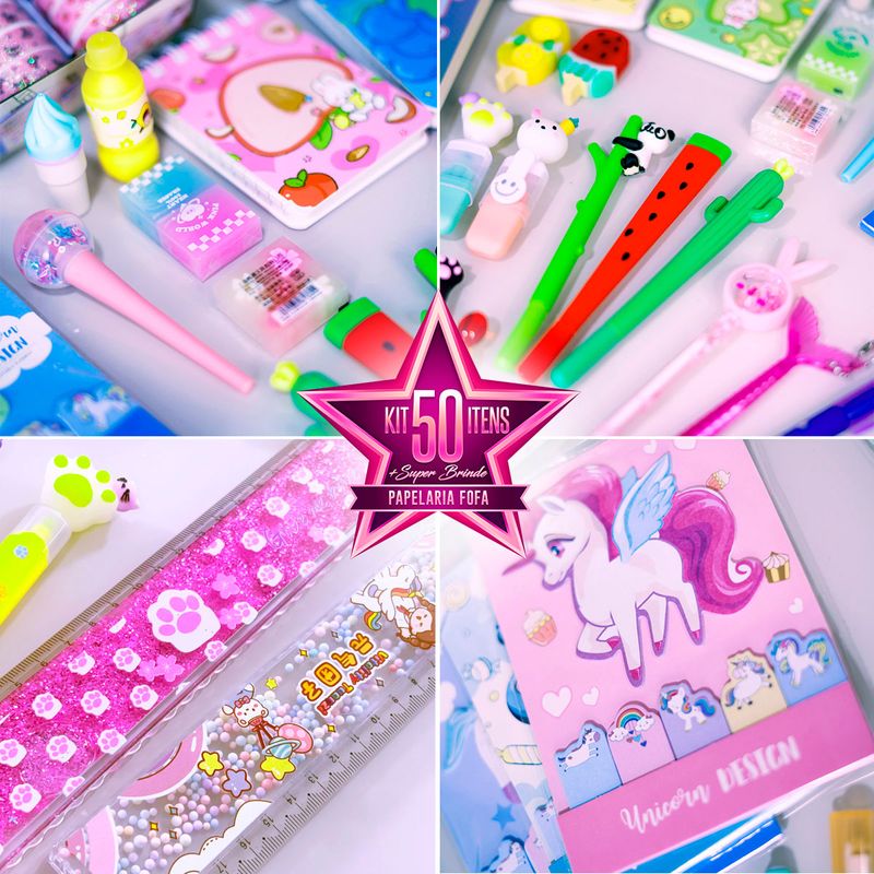 Caixa Surpresa Kawaii – 50 Itens de Papelaria Fofa + Brinde Especial!