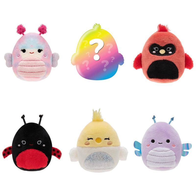 O conjunto inclui Trudy, a joaninha, Iris, a borboleta, Cazlan, o cardeal, Charlize, a calopsita e Devorah, a libélula, além de um Squishmallow surpresa. Todos são feitos com recheio super macio e têm personalidades únicas.