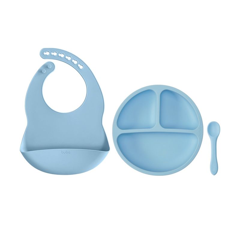 O Kit introdução alimentar inclui Prato com ventosas, Tigela também com ventosa e jogo americano na cor azul e em silicone macio da marca Buba. Kit Alimentação em SIlicone para Introdução alimentar Marca: Buba Contém: 01 prato, 01 tigela e 01 jogo americano Características do Prato de Silicone Infantil: - Divisórias para separar as porções dos alimentos - Pode ir ao micro-ondas, freezer e na parte superior da lava louças - Livre de BPA - Indicação de idade: 6m+ -Material atóxico e resistente Caracaterísticas do Bowl para crianças: - Ventosa na base - Material seguro livre de BPA e atóxico - Pode ir ao micro-ondas - Pode ser lavado na parte superior da lava louças - Não quebra e com bordas arredondadas, seguro para os pequenos - Leve, Macio e fácil de limpar Caracaterísticas do jogo americano infantil: - Feito 100% em silicone - Possui um design super fofo de nuvem - É flexível e se adere facilmente as superficies - É prático, macio, higiênico e fácil de limpar