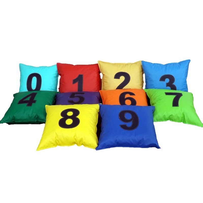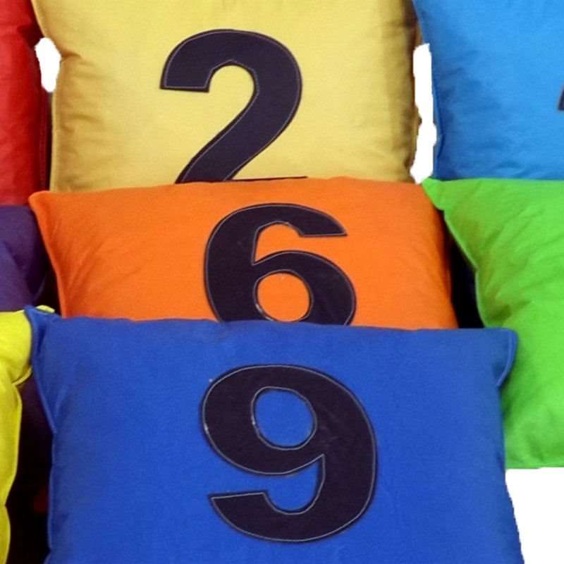 Kit composto por 10 unidades de almofadas, cada uma delas representa um número de zero a dez. Confeccionadas em couro.