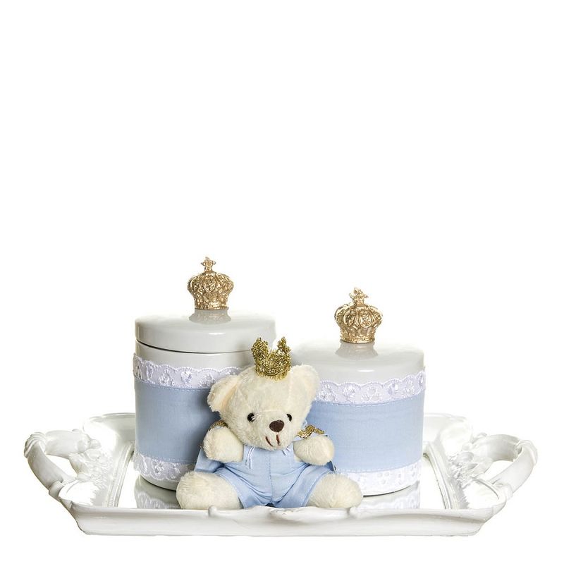 Kit higiene com bandeja de resina branca, espelho no fundo e ursinho(a) de pelúcia. As tampas dos potes são decoradas com corôas em resina dourada.