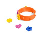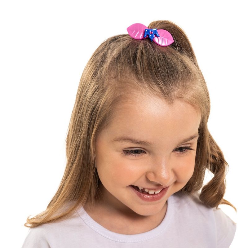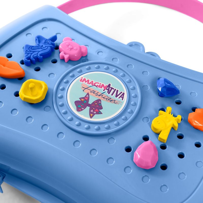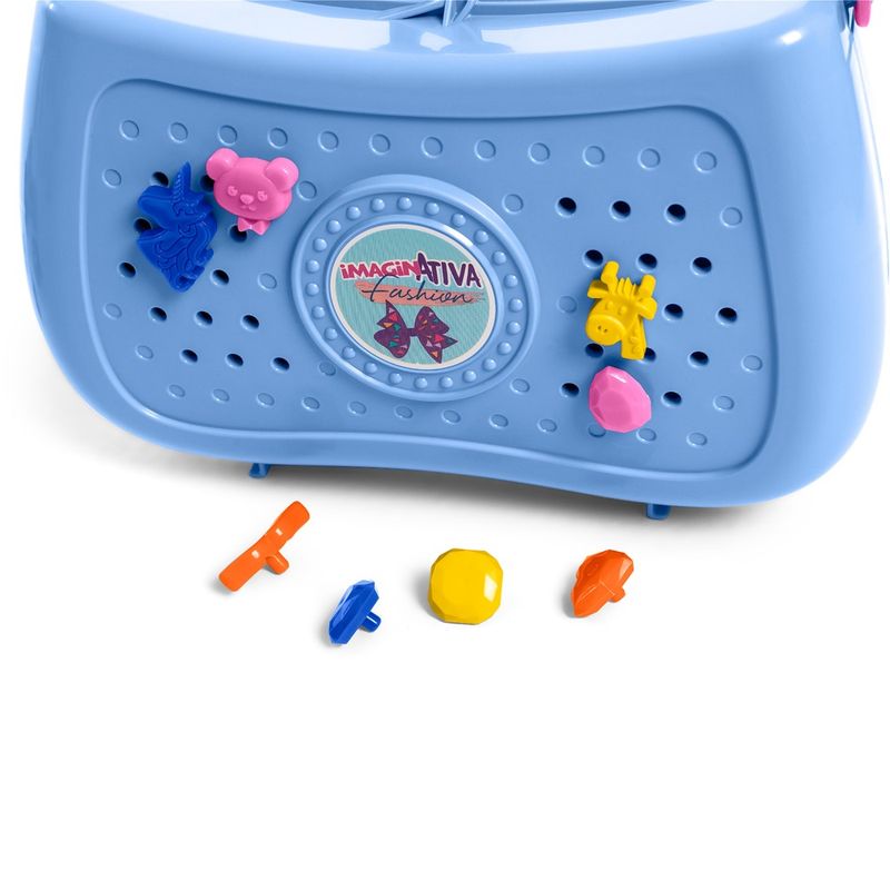Brincar, passear e ainda personalizar a bolsinha e a pulseira como quiser. Além dos acessórios como secador de cabelo e prancha, vem também presilhas para prender o cabelo. São sete botons exclusivos para encaixar na bolsinha, com formato de diamante, coração, ursinho e boquinha. E para quem não sai de casa sem uma pulseirinha, pode personalizar ela todo dia com os berloques em diversos formatos.
