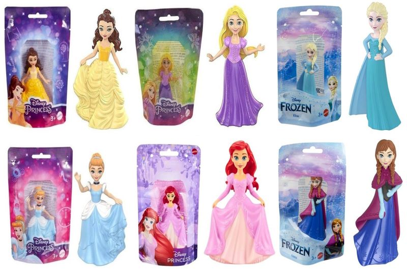 Coleção c/ 6 Mini Bonecas Princesas Disney Fabricante: Mattel. Coleção: Princesas Disney Tamanho: 9 cm de comprimento. Contém 6 Bonecas Princesas Disney. Modelos desta Coleção: #1 - Bella (HLX39) #2 - Cinderela (HLX38) #3 - Rapunzel (HLX40) #4 - Ariel (JFK58) #5 - Elsa (HRH69) #6 - Anna (HRN70)