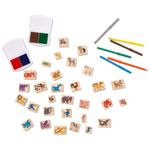 Todos os materiais são armazenados ordenadamente em uma caixa de madeira. Os carimbos de madeira ajudam crianças a partir de 4 anos a desenvolver a coordenação olho mão, ao mesmo tempo que incentivam a narração de histórias e brincadeiras imaginativas. Os carimbos de madeira são um brinquedo de desenvolvimento seguro e educativo para crianças. Este conjunto também inclui sugestões para ideias de brincadeiras adicionais e há muitos selos disponíveis, para que várias crianças possam brincar facilmente ao mesmo tempo.