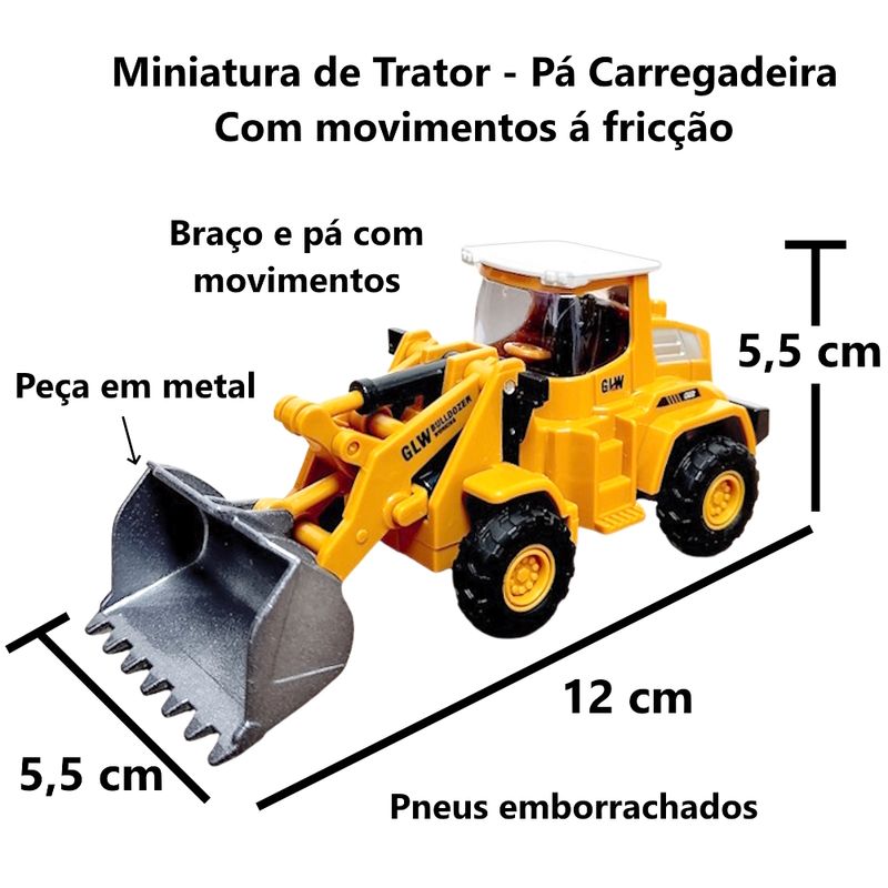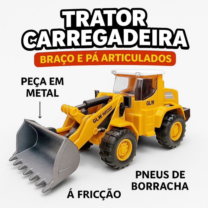 O Trator Pá Carregadeira à Fricção de Metal é uma miniatura que simula uma pá carregadeira de verdade, ideal para crianças. Feito de metal resistente, ele permite que a pá seja articulada, com pneus de borracha para maior realismo. O sistema à fricção faz o trator se movimentar, estimulando a coordenação motora, a criatividade e o raciocínio lógico.