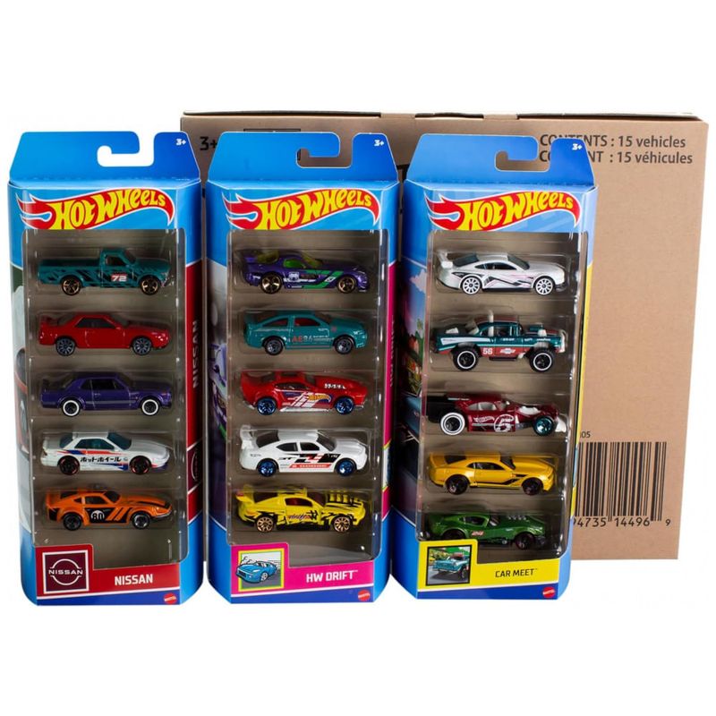 O Kit Hot Wheels com 5 pacotes inclui 15 veículos que crianças e colecionadores desejam. Cada pacote contém cinco carros de três temas diferentes para encantar os apaixonados por carros. Os carrinhos Hot Wheels estimulam a contação de histórias criativas e a exploração independente em crianças a partir de 3 anos. Cada kit é vendido separadamente, sujeito à disponibilidade. Cores e decorações podem variar. Com 3 temas diferentes, cada kit apresenta 5 carros incríveis, destacando coleções emocionantes da Hot Wheels com 15 carros de muita diversão automotiva! Os veículos Hot Wheels inspiram a contação de histórias criativas e a exploração independente em gerações de amantes de carros por meio do jogo de empurrar. Com 3 pacotes temáticos, cada kit apresenta uma variedade de veículos legais e estilosos que crianças e colecionadores adoram. Cada veículo na escala 1:64 inclui decorações incríveis, rodas que giram e detalhes perfeitos para brincar ou exibir. Presenteie com este kit de 15 carros para aniversários ou feriados, para crianças a partir de 3 anos e colecionadores da Hot Wheels que desejam a coleção mais abrangente.