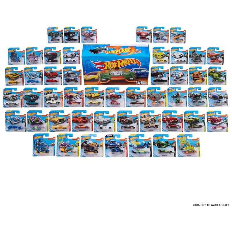 Cada veículo do pacote apresenta decorações atraentes e detalhes autênticos que os fãs de Hot Wheels e aficionados por carros adoram. Vários mixes de 50 pacotes são lançados ao longo do ano com uma variedade surpresa de carros, caminhões ou veículos de resgate de brinquedo em cada um. Os estilos podem variar. O conjunto vem em uma caixa da marca para armazenamento refrigerado, e cada veículo é embalado individualmente em sua própria embalagem para aumentar a capacidade de coleta.