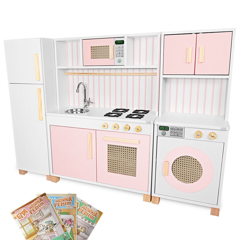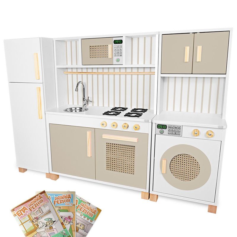 + Peças indispensáveis para interação com a obra. CARACTERÍSTICAS E FUNCIONALIDADES MATERIAL DE ALTA QUALIDADE: Fabricado em MDF 15 mm, mesmo padrão de móveis planejados, garantindo resistência e durabilidade. DESIGN LÚDICO E REALISTA: cooktop com botões que giram, pia com torneira, micro-ondas e forno com visualização interna, portas funcionais e armário com bom espaço. LIVROS EDUCATIVOS: histórias e atividades da Turma da Eita que incentivam leitura, criatividade e vínculo familiar durante a montagem e a brincadeira. FÁCIL MONTAGEM: método EtaMontei pensado para um momento divertido em família; montagem simples utilizando apenas uma chave Philips. DESENVOLVIMENTO INFANTIL: estimula coordenação motora fina, noções de organização, linguagem, raciocínio e trabalho em equipe. Confeccionado em MDF 15 mm, o conjunto é resistente e cheio de charme — integra com facilidade diversos ambientes da casa.