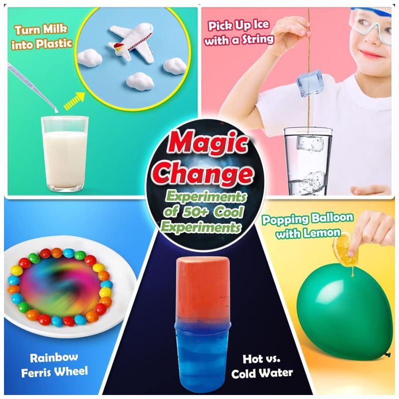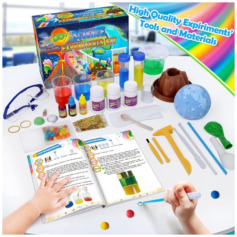 Este kit de 50 experimentos científicos é perfeito para crianças de idade entre 4 e 12 anos. Ele contém experimentos populares de ciências da Terra, química e magia científica que podem ser realizados usando utensílios domésticos comuns. As crianças também podem criar seus próprios experimentos científicos usando líquidos em casa. Este laboratório em casa para pequenos químicos leva a ciência para casa e incentiva as crianças a pensar criticamente e a resolver problemas, ajudando a aprimorar suas habilidades científicas e matemáticas. O kit inclui atividades educativas como construir e entrar em erupção um vulcão, pintar uma fonte espumosa e obter suas próprias pedras preciosas, mudar a cor da flor, soprar o balão com água, fazer chuva de arco íris pop e muito mais. Um manual de guia de aprendizagem detalhado acompanha o kit e ensina a ciência em ação nos experimentos, permitindo que seu filho desenvolva uma apreciação profunda e duradoura por uma variedade de ciências da terra, química e magia. Este brinquedo educativo de alta qualidade oferece horas de diversão e é ótimo para compartilhar com a família, amigos ou colegas de classe. As crianças se sentirão como verdadeiros cientistas em um laboratório