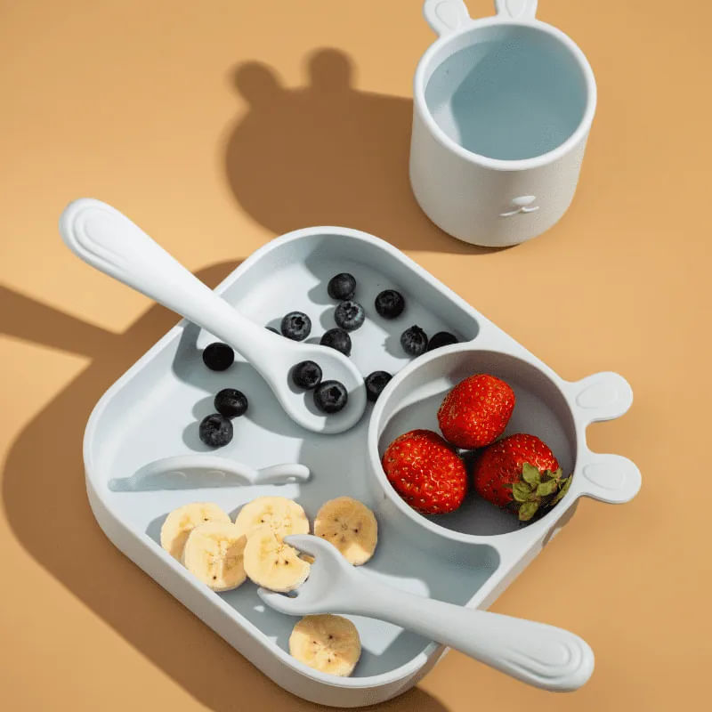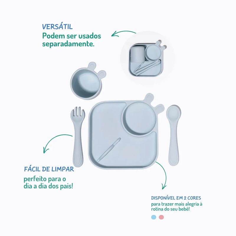 Kit de Alimentação Infantil Silicone 4 Peças Azul - Petit Piá O Kit de Alimentação Infantil Silicone 4 Peças Azul da Petit Piá é ideal para refeições práticas e seguras. Feito de silicone de alta qualidade, o conjunto inclui um prato com divisórias, uma tigela, uma colher e um garfo, tudo em um design colorido e funcional. Segurança: O silicone é 100% livre de BPA e ftalatos, garantindo total segurança para a pele sensível dos pequenos. Os utensílios têm bordas arredondadas e são antideslizantes para evitar acidentes durante o uso. Conforto: O material de silicone é macio e flexível, proporcionando um ajuste confortável e leve. O prato com ventosas adere bem à superfície, evitando derramamentos e facilitando a autonomia da criança. Durabilidade: Resistente, o silicone mantém sua forma e cor após várias lavagens. Facilidade no Uso: As peças são fáceis de limpar e laváveis na lava-louças, tornando o dia a dia dos pais mais simples. O design intuitivo ajuda a criança a aprender a comer com talheres. Benefícios para a Criança: O conjunto estimula o interesse pelas refeições com suas cores e formatos ergonômicos. Facilita o desenvolvimento da coordenação motora e promove uma alimentação mais independente. Desenvolvimento e Bem-Estar: Facilita o aprendizado alimentar e reduzir a bagunça, o Kit de Alimentação Infantil contribui para um ambiente de refeições mais agradável e tranquilo, ajudando a criança a desenvolver hábitos alimentares saudáveis.