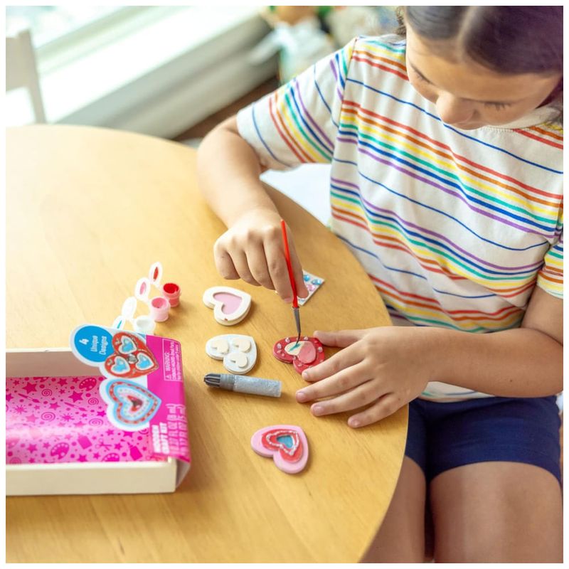 Cada conjunto contém 4 ímãs tridimensionais em designs diferentes, 4 potes de tinta, um pincel, 12 adesivos de pedras preciosas e cola glitter para adicionar brilho extra.