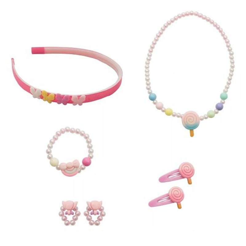 Inclui: Bolsa com alça, chaveiro, pulseira, anel colar, tiara e presilhas.