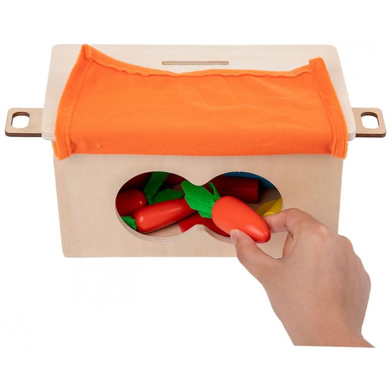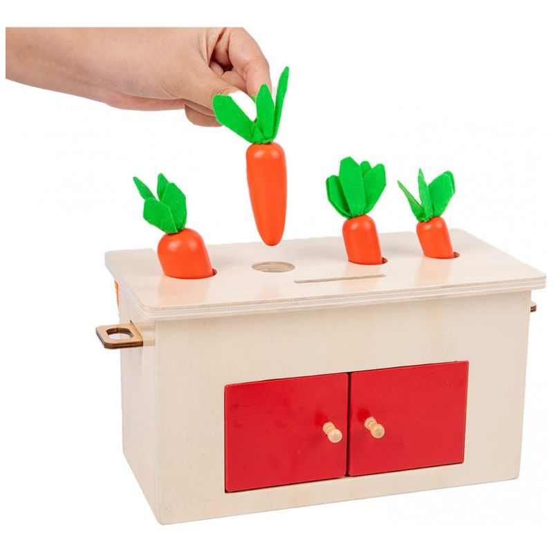 Deixe as crianças aprenderem a combinar: Este brinquedo permite que as crianças coloquem cenouras de tamanhos diferentes em buracos correspondentes, criando uma atividade divertida e desafiadora para as crianças aprenderem a combinar e classificar.