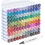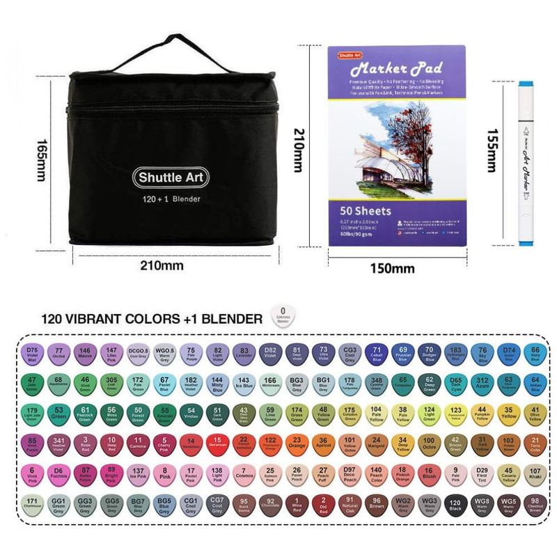 121 CORES ACESSÓRIOS 120 marcadores permanentes vibrantes 1 liquidificador incolor 1 bloco de marcadores 1 estojo de zenamento 1 cartela de cores. Nosso bloco de marcadores tem uma superfície lisa que pode evitar sangramento, manchas e enevoamento para o seu trabalho artístico, estojo preto com zíper é perfeito para zenamento e viagens, tabelas de cores podem registrar sua coleção de cores em um só lugar. Mais acessórios com preço mais barato