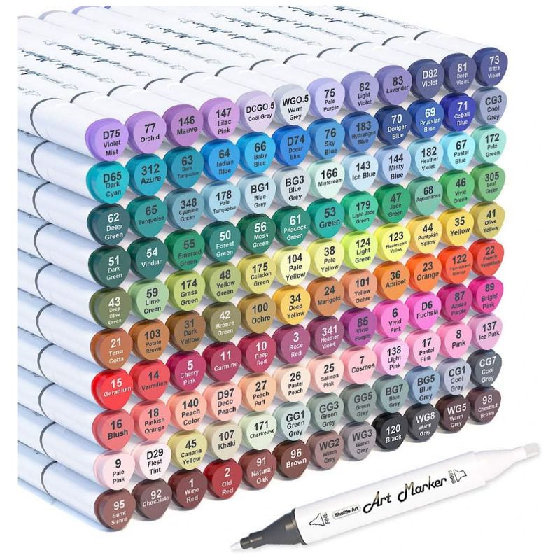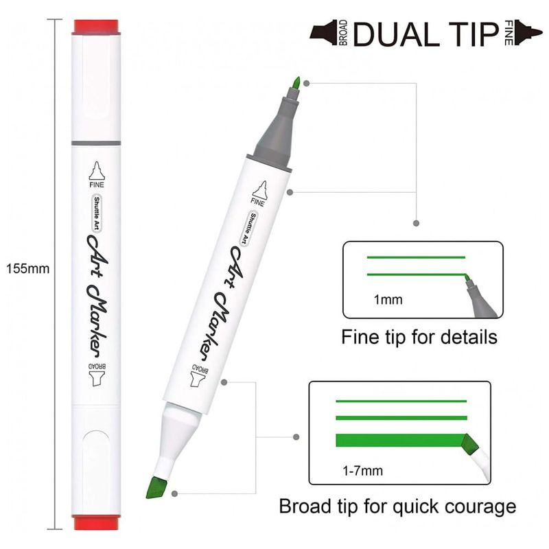 PONTA DUPLA Os marcadores permanentes à base de álcool de ponta dupla Shuttle Art têm uma ponta larga de para cobertura rápida e uma ponta de bala pontiaguda de para destaques, sombras, esboços e escrita em geral. Nossos marcadores escrevem bem e se misturam facilmente, são classificados para 300 metros de uso contínuo, o que fornece uma grande quantidade de tinta por marcador.