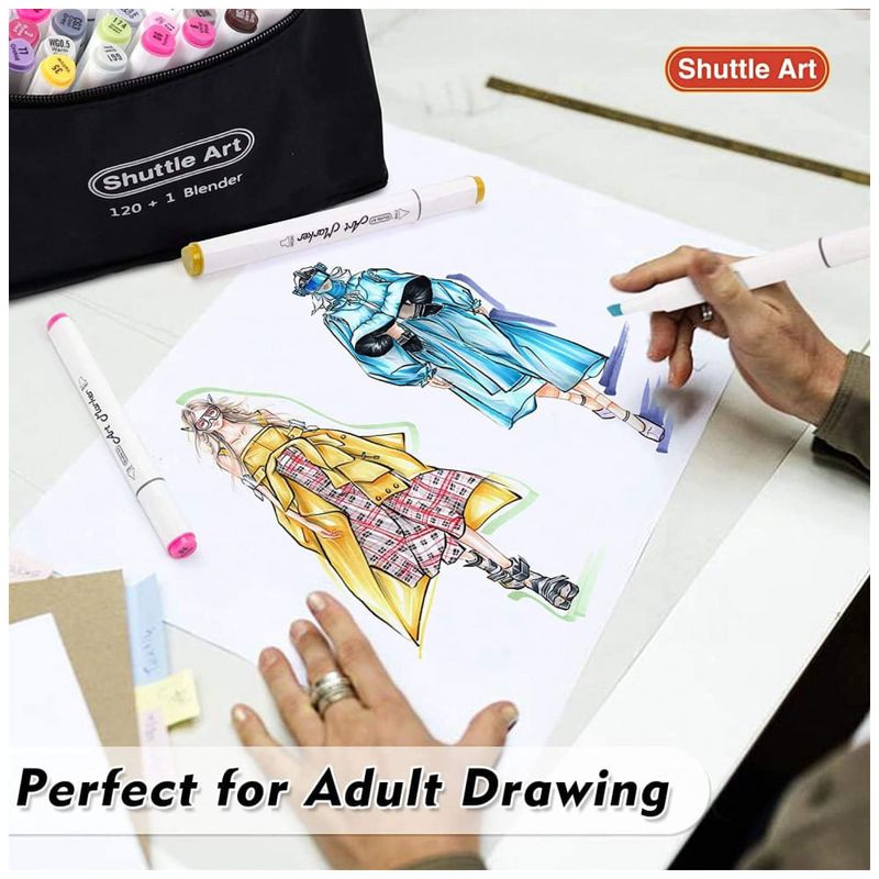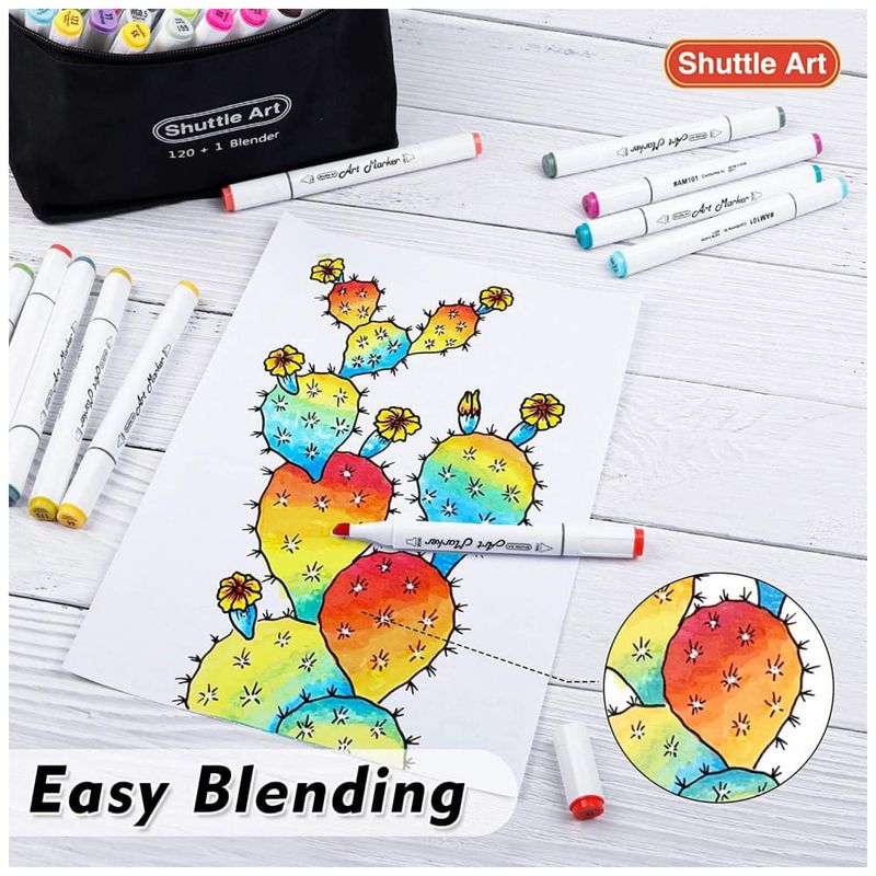 FÁCIL DE MISTURAR TINTA E FORMA TRIANGULAR Os marcadores de ponta dupla Shuttle Art misturam se e estratificam se bem sem deixar riscos para trás e secar rapidamente. Misturar cores é muito fácil, colocando uma cor única em outra, criando uma paleta de cores ilimitada. O barril em forma de quadrilátero ergonômico exclusivo pode ser deslizado com facilidade e conforto. A forma única também evita que os marcadores saiam de superfícies lisas.