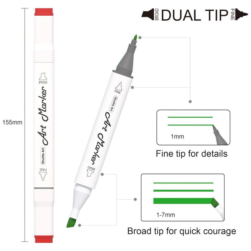 PONTA DUPLA Os marcadores permanentes à base de álcool de ponta dupla Shuttle Art têm uma ponta larga de para cobertura rápida e uma ponta de bala pontiaguda de para destaques, sombras, esboços e escrita em geral. Nossos marcadores escrevem bem e se misturam facilmente. Eles são classificados para 300 metros de uso contínuo, o que fornece uma grande quantidade de tinta por marcador.