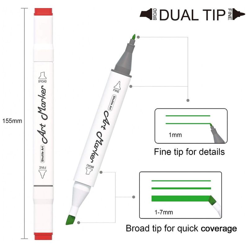 PONTA DUPLA Os marcadores permanentes à base de álcool de ponta dupla Shuttle Art têm uma ponta larga de para cobertura rápida e uma ponta de bala pontiaguda de para destaques, sombras, esboços e escrita em geral. Nossos marcadores escrevem bem e se misturam facilmente. Eles são classificados para 300 metros de uso contínuo, o que fornece uma grande quantidade de tinta por marcador.