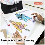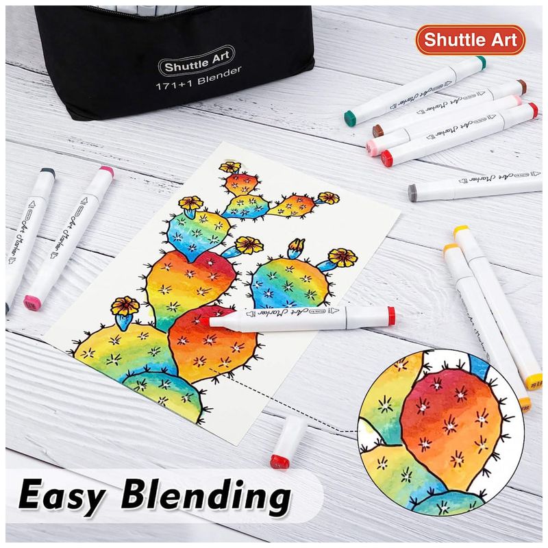 FÁCIL DE MISTURAR TINTA E FORMA QUADRADA Os marcadores de ponta dupla Shuttle Art misturam se e estratificam se bem sem deixar riscos para trás e secar rapidamente. Misturar cores é muito fácil, colocando uma cor única em outra, criando uma paleta de cores ilimitada. O barril em forma de quadrilátero ergonômico exclusivo pode ser deslizado com facilidade e conforto. A forma única também evita que os marcadores saiam de superfícies lisas.