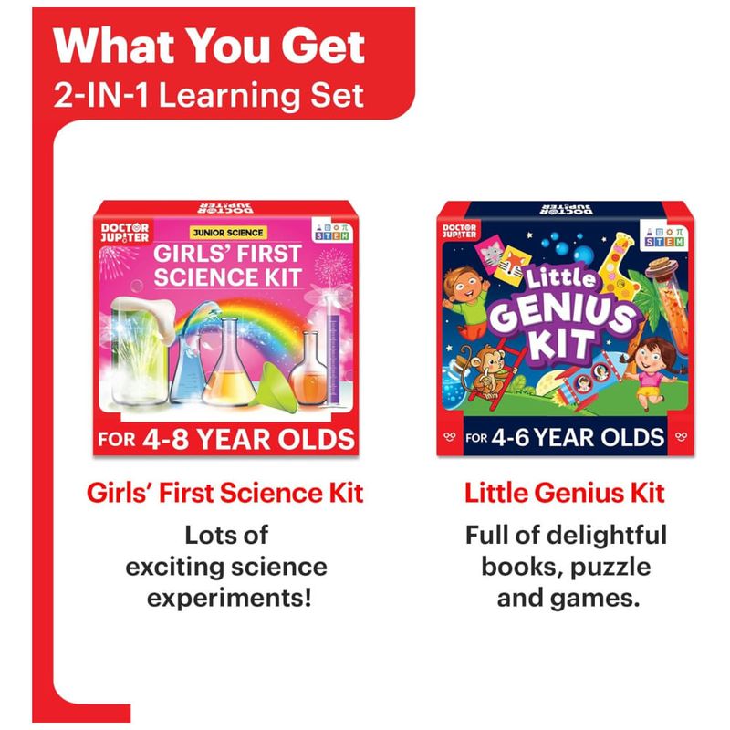 Com o kit Doctor Jupiter Girls First Science, sua filha terá a oportunidade de realizar 50 experimentos científicos divertidos e seguros, sem precisar usar telas. Este kit científico é feito com equipamentos de alta qualidade e produtos químicos seguros, ajudando a promover um amor precoce pela ciência.
