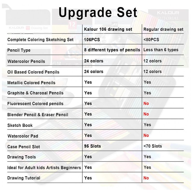 Este kit de colorir e sketch KALOUR com 106 peças reúne lápis artísticos de diferentes tipos, acessórios de desenho, sketchbook e bloco de aquarela em um estojo de nylon com zíper. A seleção foi pensada para estudos de desenho, coloração, sombreamento e mistura em nível iniciante e intermediário.