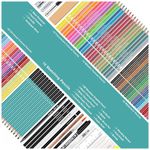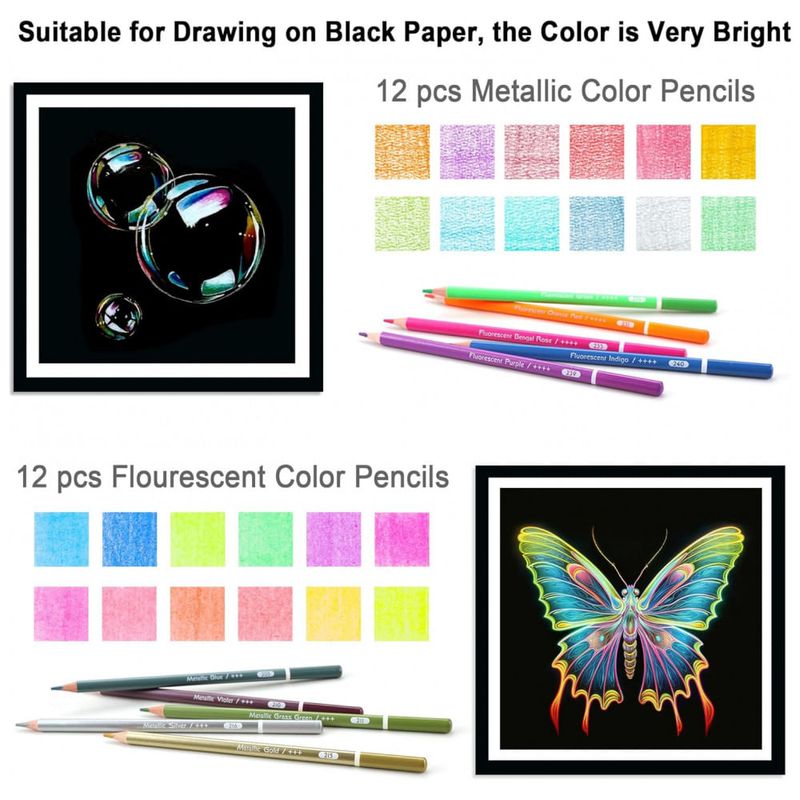 O conjunto inclui 91 lápis para desenho e cor, entre sketch, carvão, lápis de cor, aquareláveis, metálicos, fluorescentes, carvão branco, blender incolor, lápis borracha e grafite integral. Cada lápis é identificado com nome e número da cor, facilitando a organização das paletas e a repetição de combinações em diferentes trabalhos.