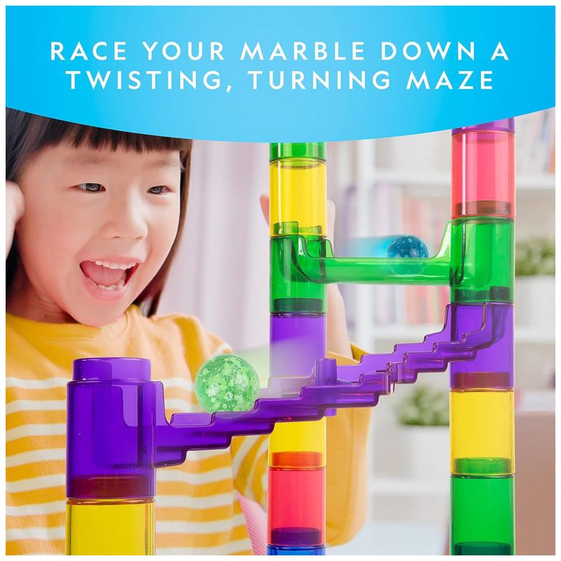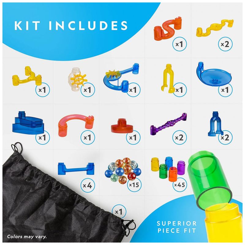 PEÇAS DE ACABAMENTO À VISTA Este kit de construção foi projetado para se encaixar confortavelmente, para que seu labirinto de mármore não desmorone enquanto você joga. Com 5 bases robustas, 15 peças de ação emocionantes e 45 peças de pista lisas e claras, nosso kit possui inúmeras configurações imaginativas.