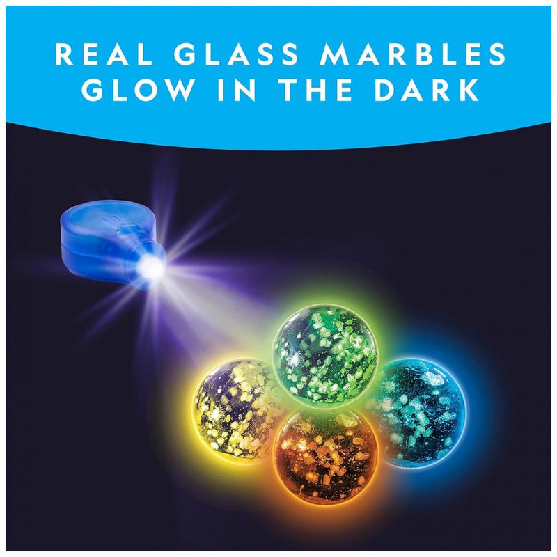 LUGAR NOS MÁRBIOS ESCUROS O kit de mármore inclui 6 cores diferentes de brilho nas bolinhas de vidro escuras que brilham ao ziguezague pela corrida de mármore. Também inclui luz UV para recarregar rapidamente as bolinhas de gude.