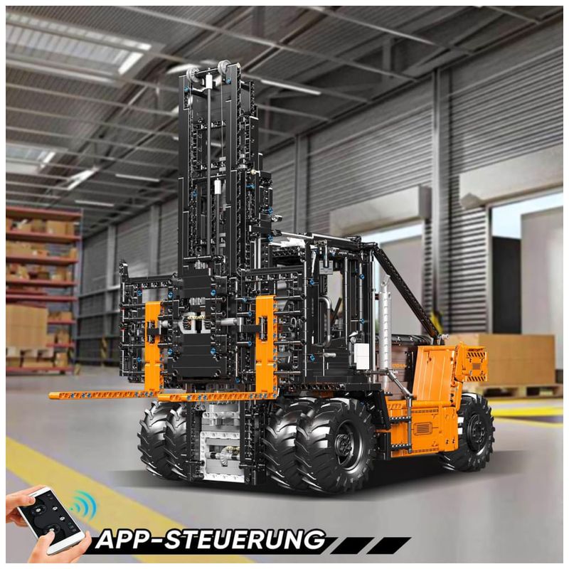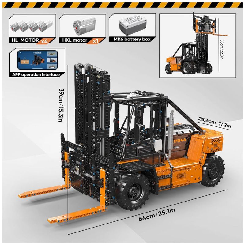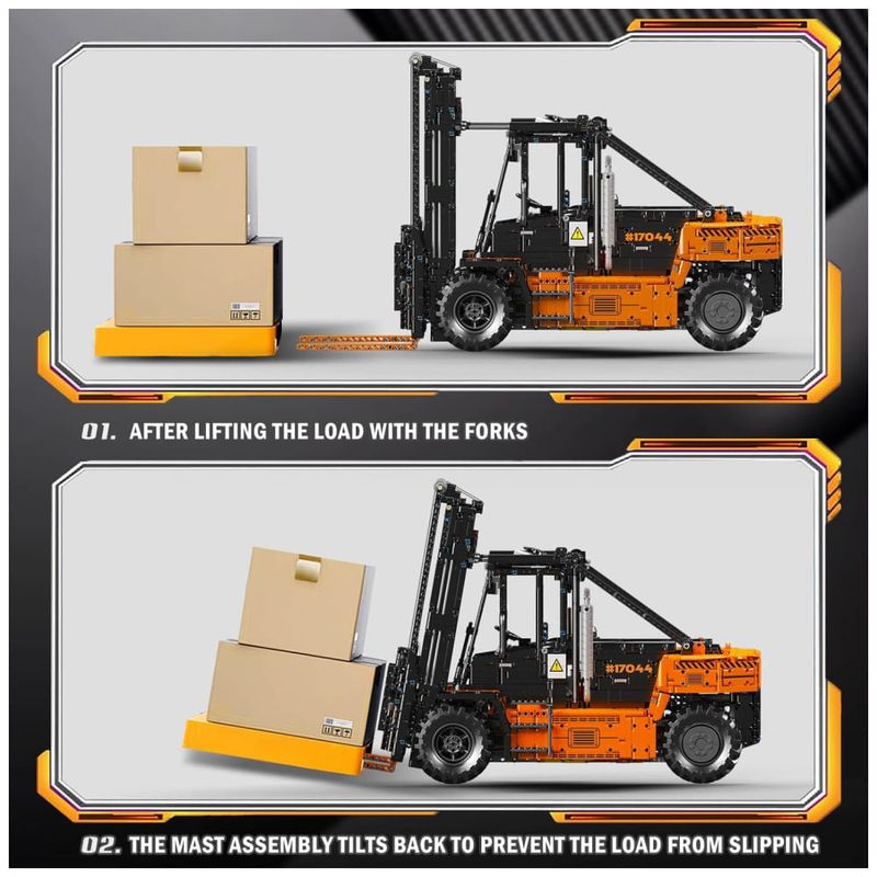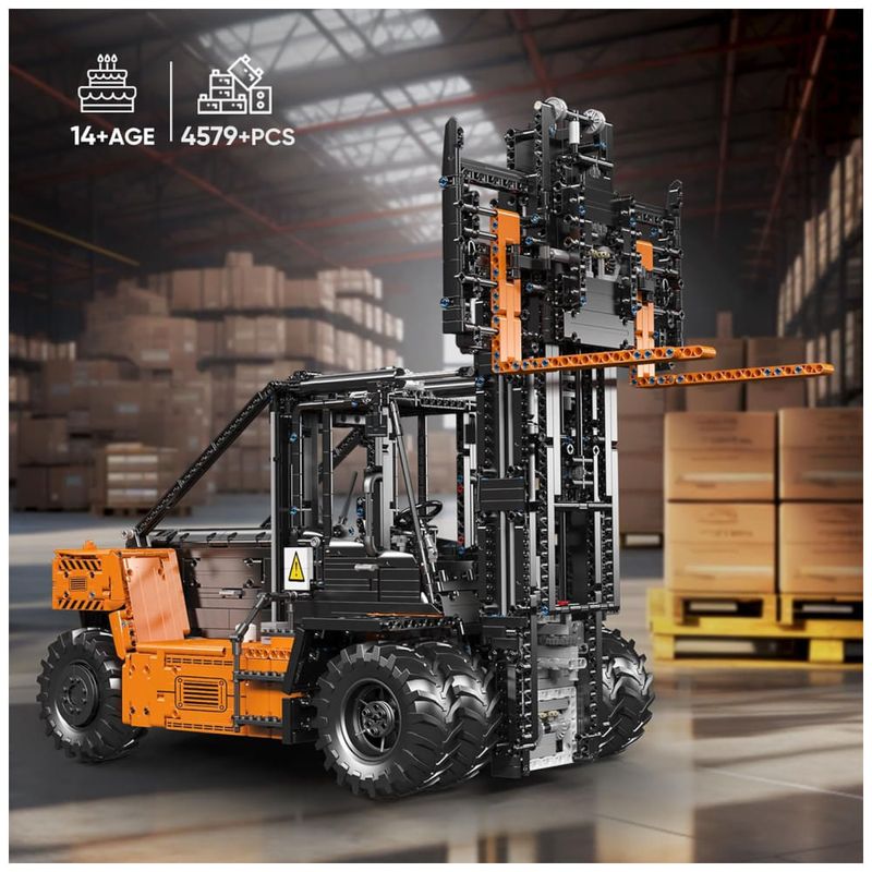 Criado para entusiastas de blocos de construção de tecnologia, este produto possui uma riqueza de recursos e é modelado no formato de uma empilhadeira pesada real, com linhas de modelagem suaves e proporções coordenadas. O estilo interior e exterior é feito principalmente de tijolos para restaurar em grande parte a aparência do veículo.