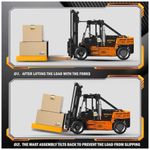 Este produto é uma empilhadeira controlada por aplicativo que possui diversas funcionalidades. É possível abrir o capô, girar os limpadores, controlar a inclinação do mastro para frente e para trás, ajustar a largura dos discos dos garfos e levantar e abaixar dois garfos separadamente. O console da cabine gira 360 graus e o conjunto do mastro se inclina para frente e para trás, além de possuir um design simulado de ligação do motor.