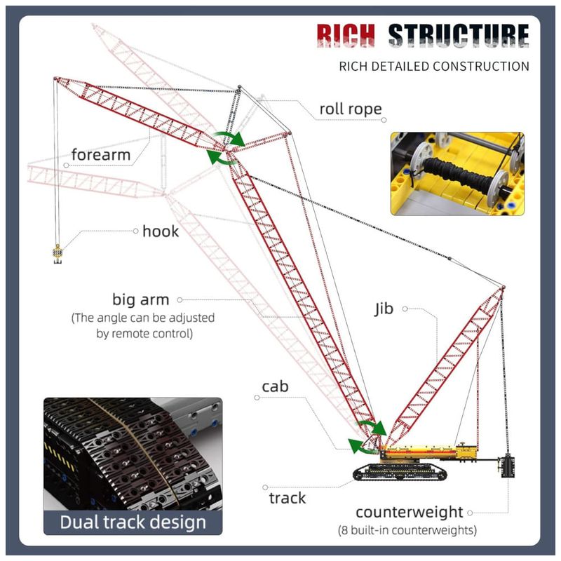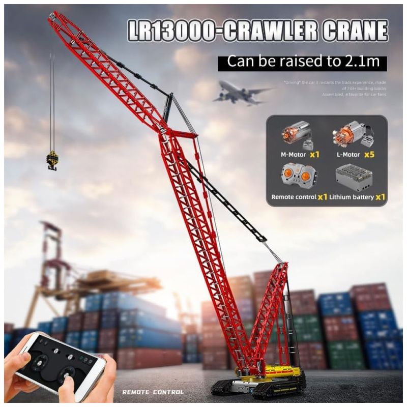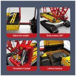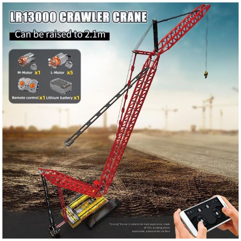 O guindaste sobre esteiras Mold King tem motores e bateria de lítio, o que o torna uma versão dinâmica do modelo. O produto finalizado mede 74 polegadas X 36,98 cm X 68 polegadas e sua altura máxima pode ser estendida até 209,8 cm.