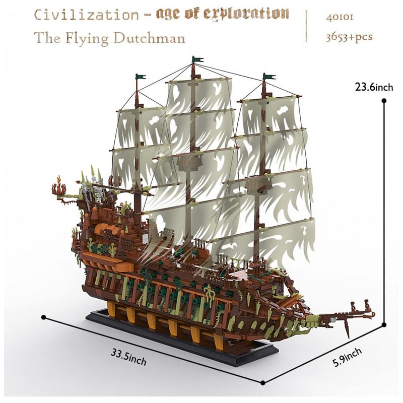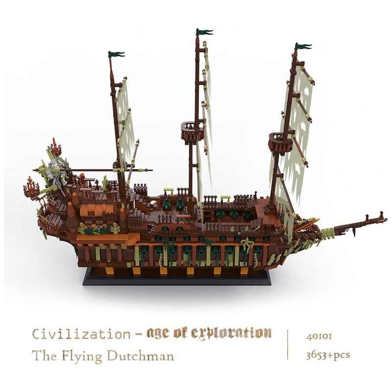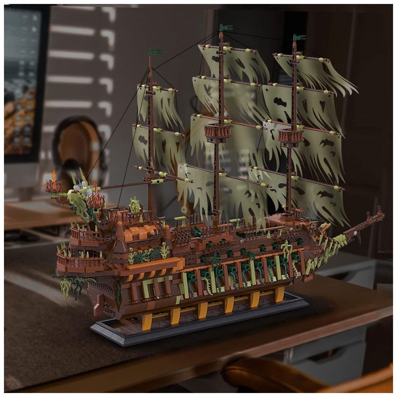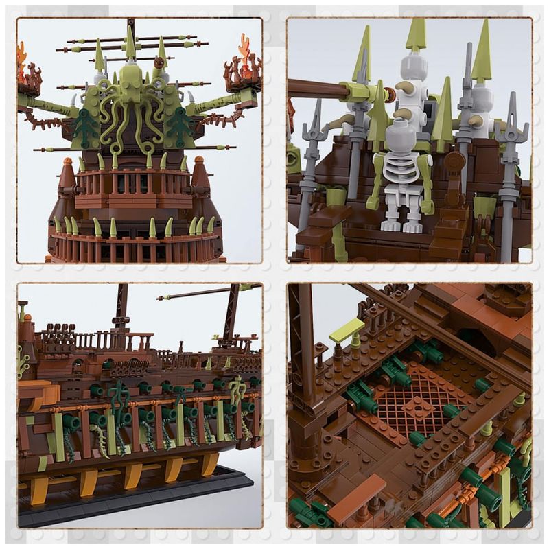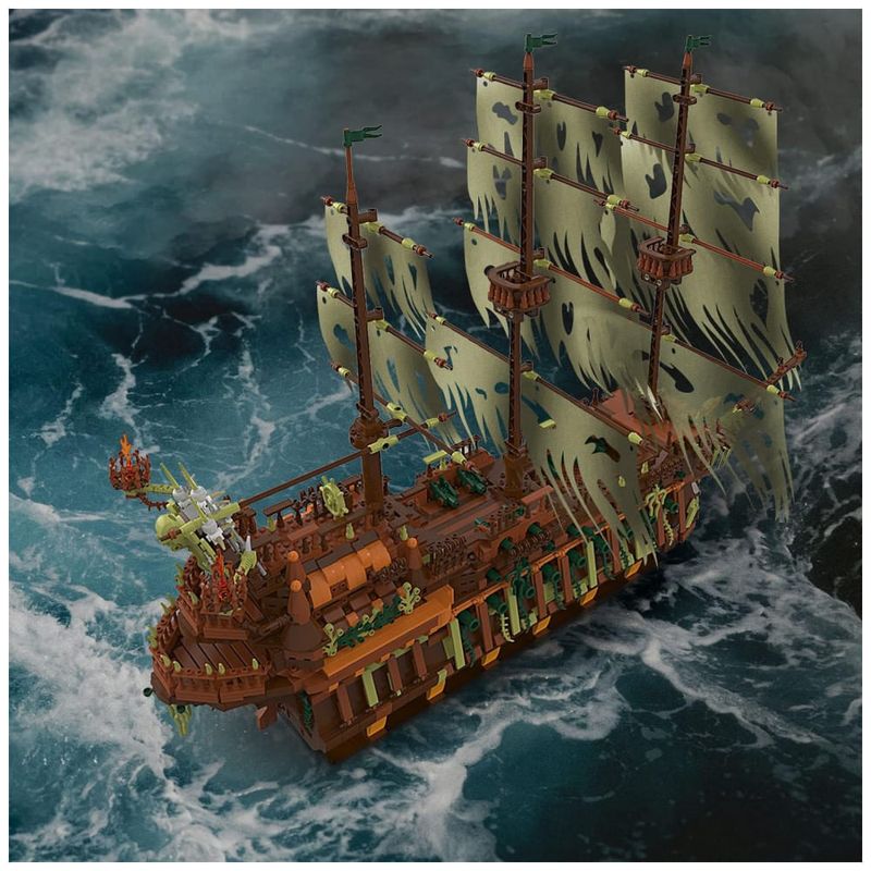 Modelo de navio legal: O navio preto JMBricklayer composto por 3653 unidades. O modelo do navio é muito realista, incluindo canhões nas laterais do casco, 3 mastros e a torre de vigia. Com a missão de escoltar os mortos no mar até o submundo, este é um navio fantasma que nunca poderá voltar para casa.