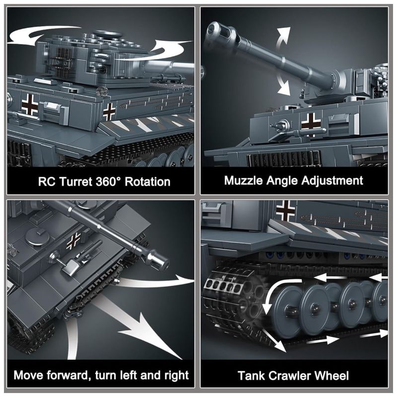 Este brinquedo de bloco de construção Tiger Tank equipado com motores de alto desempenho e chips inteligentes, pode realizar curvas para frente, para trás, para a esquerda e para a direita e rotação in situ, através do controle remoto portátil ou do aplicativo de telefone móvel.