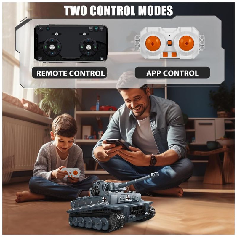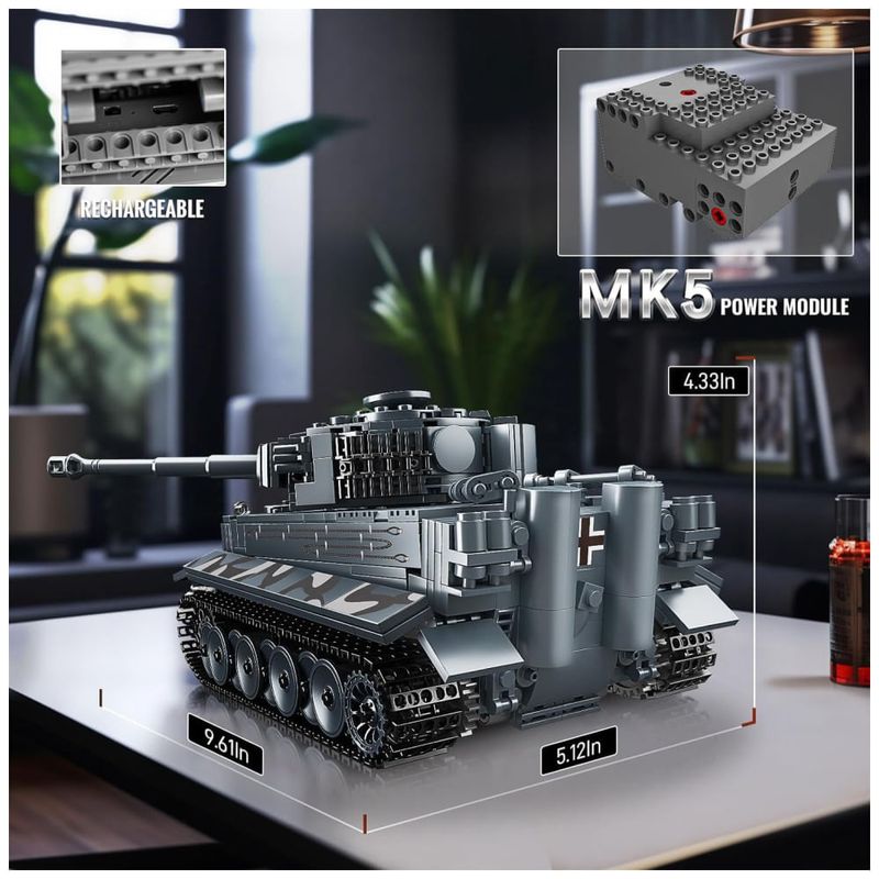 Este kit de blocos de construção de modelo de tanque é compatível com blocos de construção convencionais e baseado no protótipo do Tiger Tank, com um total de 800 peças de tijolos. O modelo é equipado com motores de alto desempenho e chips inteligentes, permitindo dois modos de operação de controle remoto Bluetooth controle remoto portátil e aplicativo de telefone móvel.