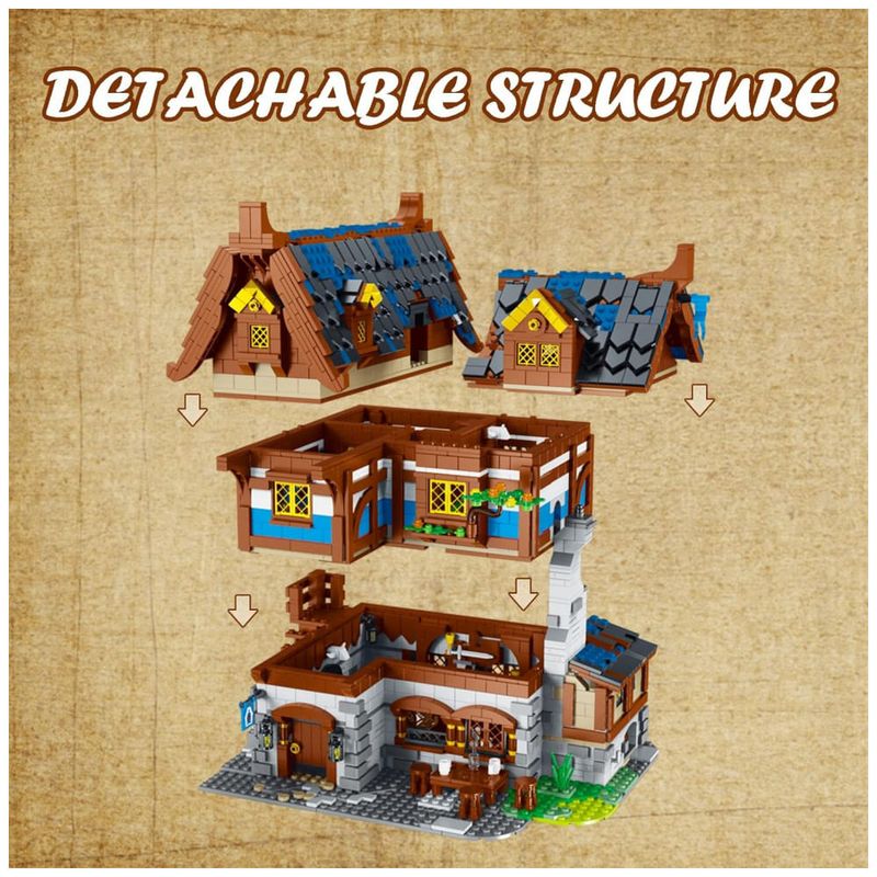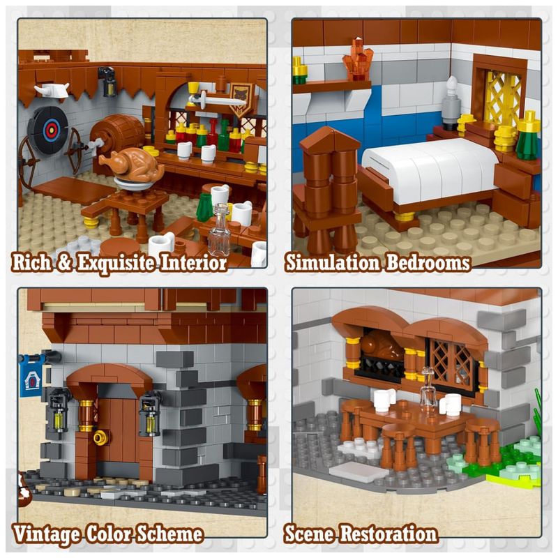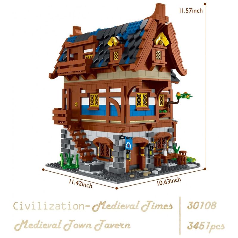 O kit de taverna medieval consiste em 3.451 blocos de qualidade e é um lindo modelo de vista para a rua quando concluído. O tamanho final da construção da casa é aproximadamente 29,4 C x 29 L x 27 centímetros A, além do esquema de cores vintage do brinquedo de construção faz com que este modelo de brinquedo pareça muito espetacular. Além disso, nossas peças são projetadas em embalagens separadas e vêm com instruções coloridas que podem ajudá lo a montar facilmente o conjunto da casa, o que será uma experiência de jogo divertida.