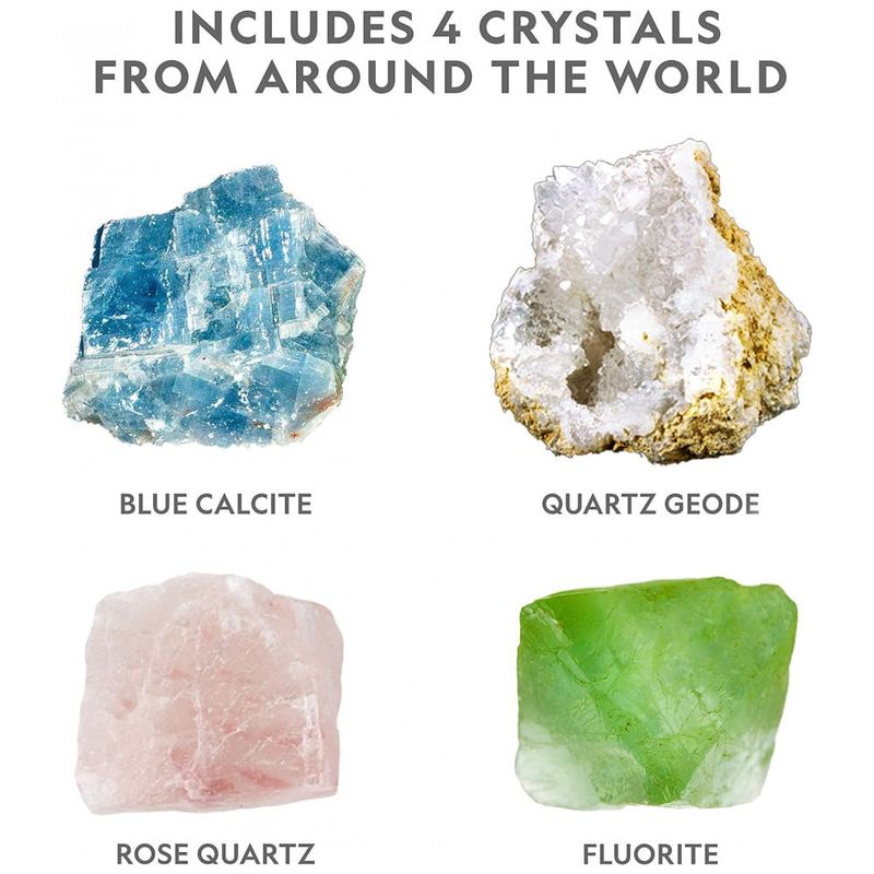 INCLUI AMOSTRAS DE CRISTAL REAIS Comece ou expanda sua coleção de pedras Vem com 4 amostras de pedras preciosas reais: quartzo rosa, fluorita, calcita azul e geodo de quartzo. Aprenda sobre as pedras preciosas do kit com o guia de aprendizagem colorido incluído
