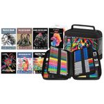 Todos os materiais são acondicionados em estojo de viagem portátil, com compartimentos organizados para lápis, acessórios e blocos. O formato facilita o transporte e mantém o conteúdo protegido durante deslocamentos para aulas, ateliês ou uso doméstico.