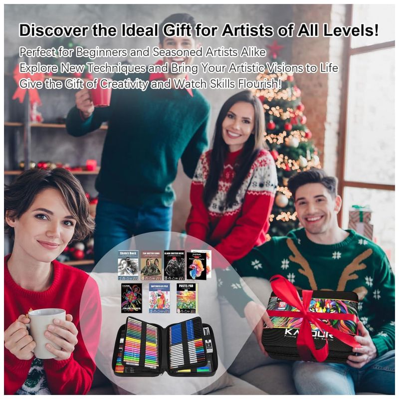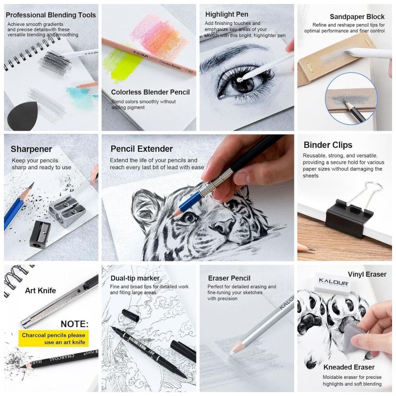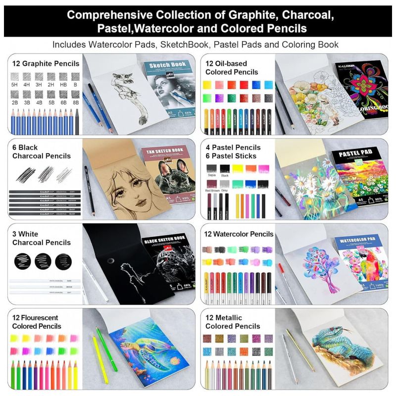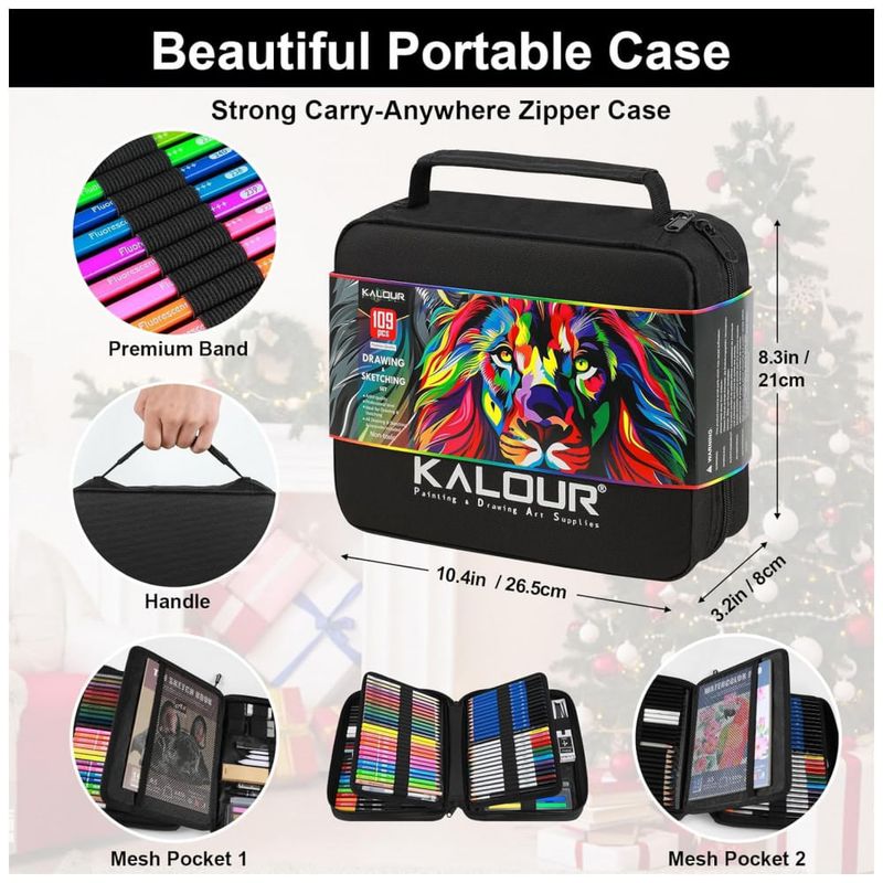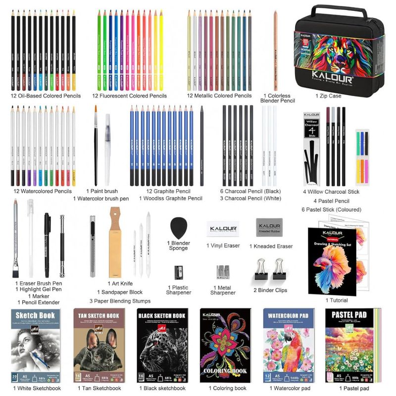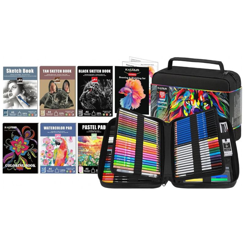 Este kit de desenho KALOUR PDAS com 109 peças reúne lápis coloridos, aquareláveis, metálicos, fluorescentes, grafite e carvão, além de acessórios e blocos de desenho, formando um conjunto completo para desenho e ilustração. Cada lápis vem identificado com nome e número da cor, facilitando a organização e a repetição de combinações em diferentes trabalhos.